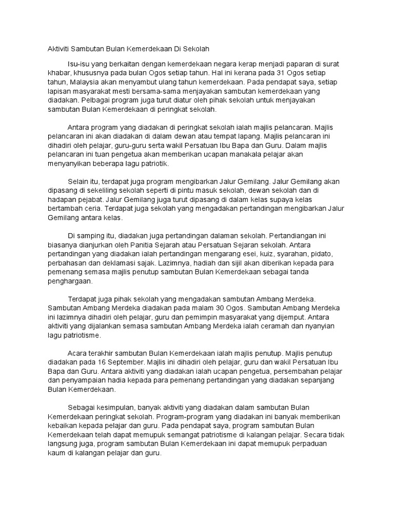Tanggal 31 ogos setiap tahun , sambutan bulan kemerdekaan akan diadakan sama ada di peringkat kebangsaan, peringkat negeri mahupun di peringkat sekolah. Selain itu, sambutan hari kemerdekaan di peringkat sekolah dan instiusi pengajian juga penting kerana generasi muda adalah tunjang masa hadapan negara. Usia kemerdekaan yang sudah mencapai 52 tahun ini tidak seharusnya melalaikan kita. Tb sambutan hari kemerdekaan pada 2019. Selain membuat sambutan kemerdekaan di sekolah, kita juga boleh menganjurkan kempen kibarkan jalur gemilang. Rangka karangan sambutan hari kemerdekaan di sekolah. September 2, 2016september 2, 2016 mardziah8701. Pada 14 september 2012 telah diadakan sambutan hari kemerdekaan dan hari malaysia peringkat sekolah. Sambutan bulan kemerdekaan kali ini diawalkan sedikit memandangkan minggu berikut adalah bulan ramadhan. Tahun 2020 tepat tanggal 17 agustus merupakan hari kemerdekaan indonesia. Puan maselah selaku guru besar sekolah kebangsaan seri perling 2. Kata sambutan ketua osis baru (pelantikan osis). Sekolah kebangsaan haji abdullah sadun laporan sambutan hari raya aidilfitri 2017 06 julai 2017 (khamis).