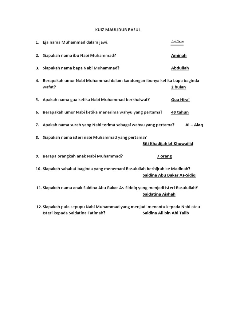 Soalan kuiz maulidur rasul ( wasatiyyah penjana kesatuan ummah )(pra sekolah) 1. Semoga cinta dan kasih sayang kita kepada junjungan besar rasulullah saw akan terus mekar dalam diri. Bertepatan dengan hari senin, itsnain. Khadijah bt khuwailid ( tahun 1) 1. Klik sepanduk di bawah untuk 4 pusingan dan 40 soalan, mengenai anda, yang boleh anda. Beliau telah berjaya menarik minat murid dan berjaya menyampaikan ceramah dengan jayanya. Syukur alhamdulillah, kita masih lagi bernafas sehingga hari ini. Siapakah nama nabi kita ?jawapan : Soalan kuiz terbuka pendidikan islam. 2 nota panduan keselamatan jalanraya. Namakan ibu kepada nabi muhammad ?.jawapan : Bagi perkongsian kali ini, kami akan berkongsi tentang mengenai poster maulidur rasul ini. Nabi isa alaihi salam 2.